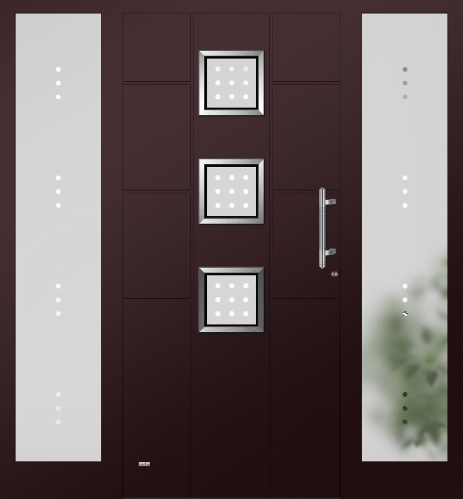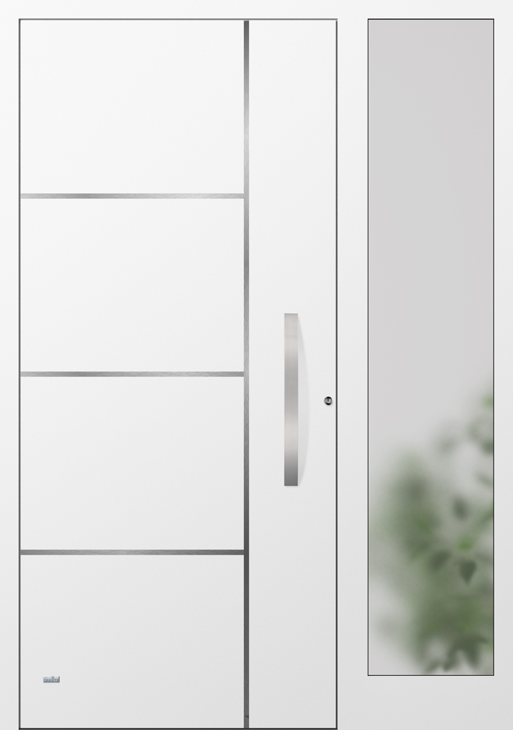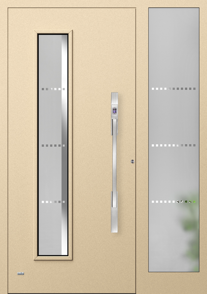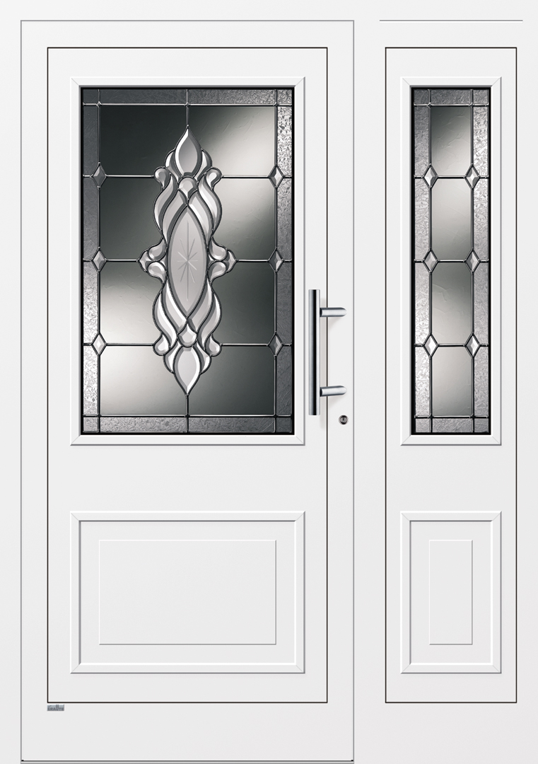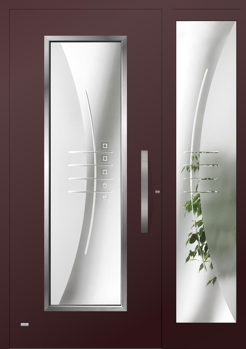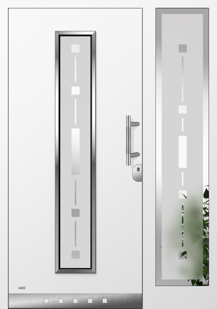 Applikationen in pflegeleichter Edelstahloptik sowie flächenbündig eingearbeitete Dekorelemente und Designverglasungen, deren Dekor sich in der Verglasung des Haustürseitenteils fortsetzt, sind einige der charakteristischen Merkmale dieser Serie.