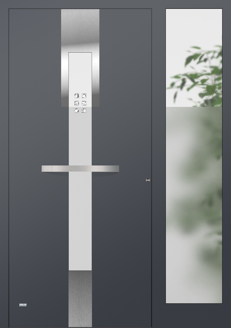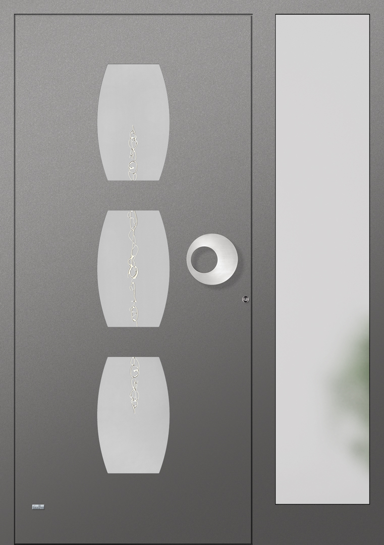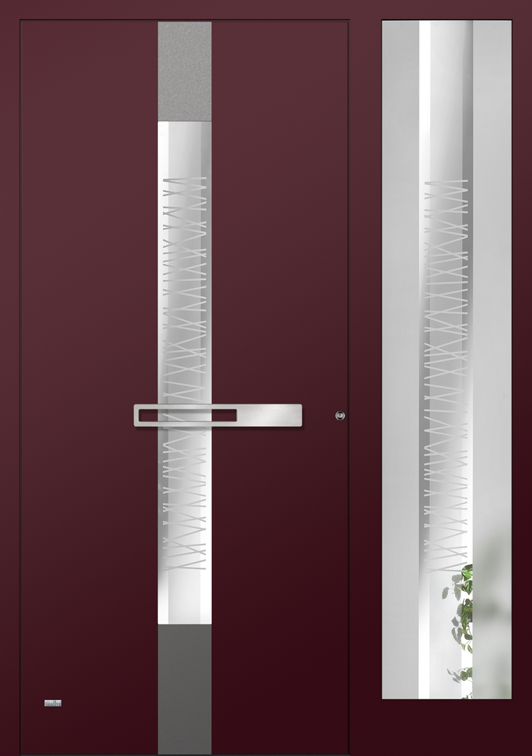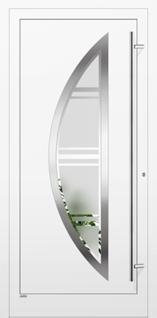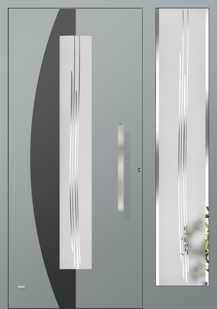 Applikationen in pflegeleichter Edelstahloptik sowie flächenbündig eingearbeitete Dekorelemente und Designverglasungen, deren Dekor sich in der Verglasung des Haustürseitenteils fortsetzt, sind einige der charakteristischen Merkmale dieser Serie.