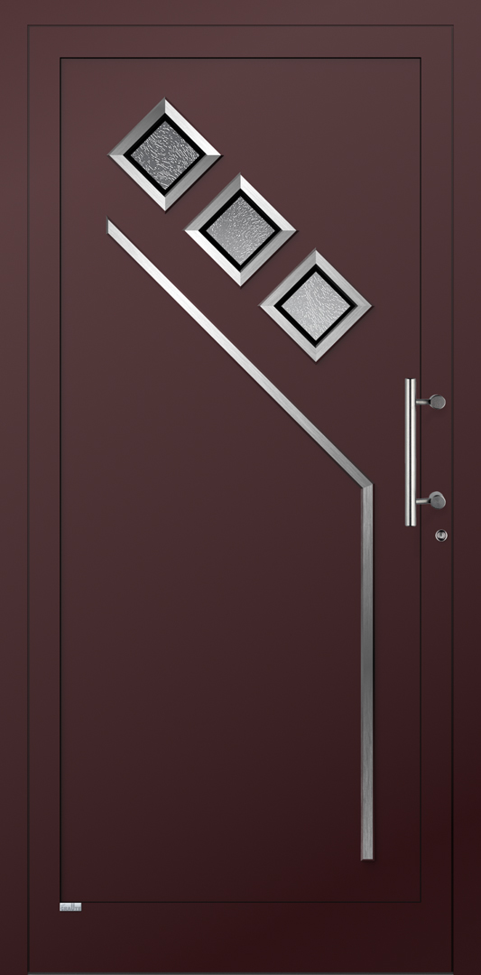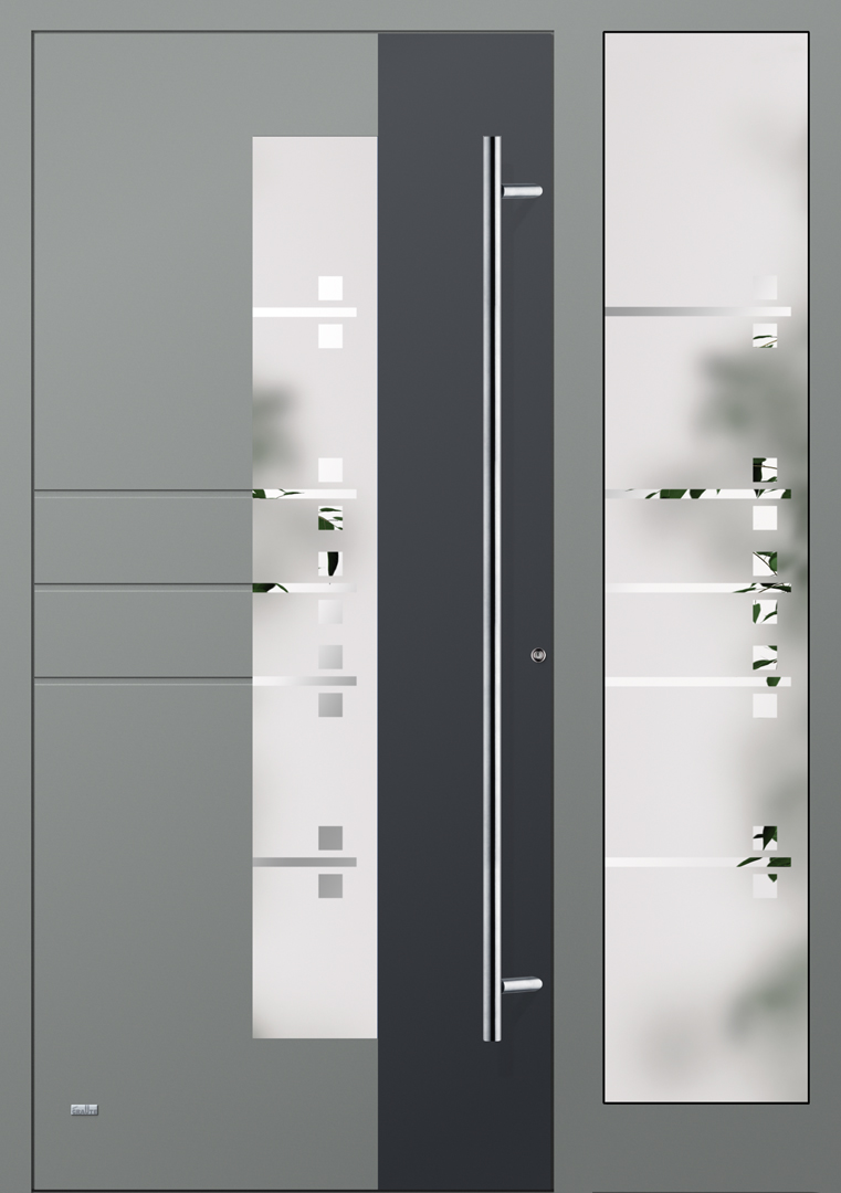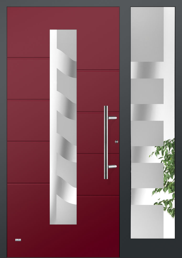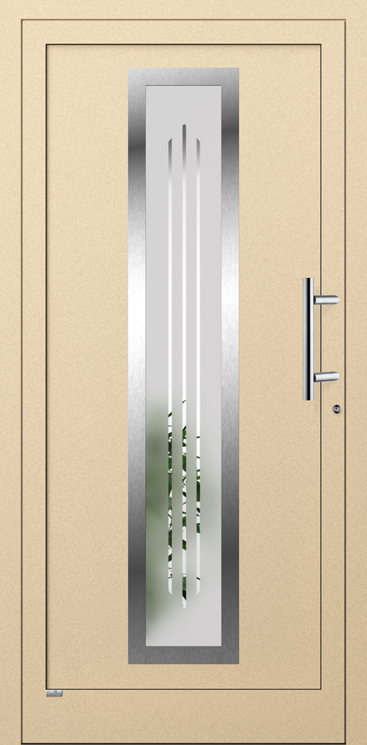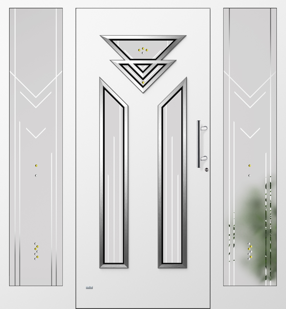 Applikationen in pflegeleichter Edelstahloptik sowie flächenbündig eingearbeitete Dekorelemente und Designverglasungen, deren Dekor sich in der Verglasung des Haustürseitenteils fortsetzt, sind einige der charakteristischen Merkmale dieser Serie.