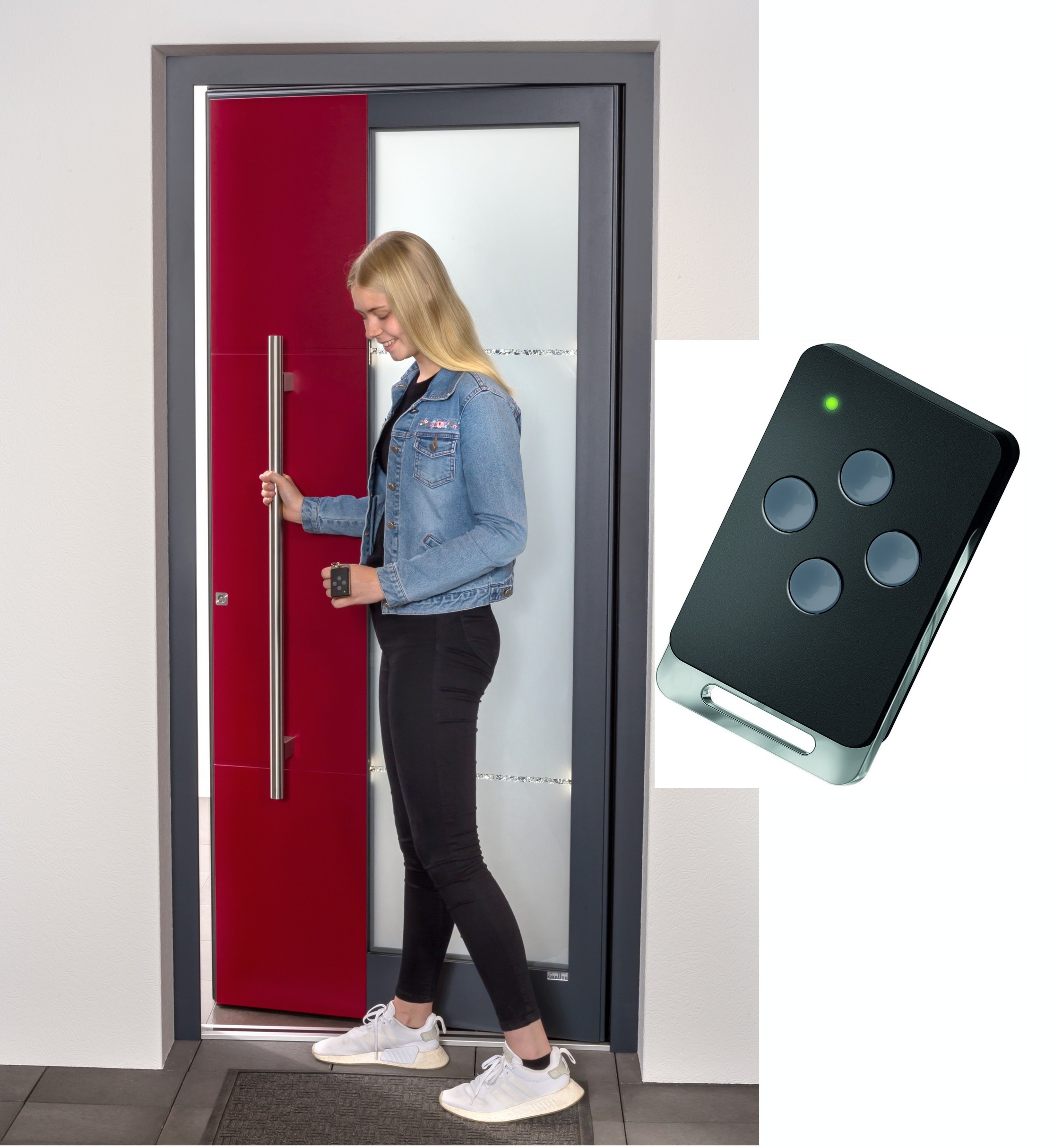 Besonderes Know-how bietet der "open-door" Funktionsgriff. Hierbei öffnet sich die Tür, ohne dass man den Schlüssel aus der Tasche nehmen muss. Der Griff muss nur berührt werden und schon öffnet sich die GRAUTE-Tür, jedoch nur wenn der dazugehörige Aktiv-Transponder in Bewegung ist.