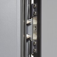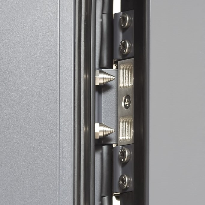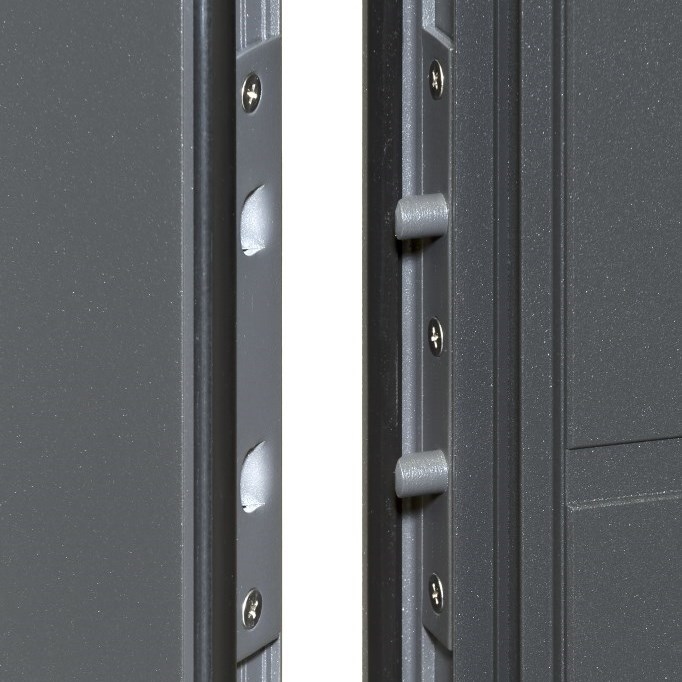 Das 7-Punkt-Schwenkriegel-Bolzenschloss mit durchgehender Schließleiste in Edelstahl sichert mit zwei stabilen Stahl-Schwenkriegeln, vier Stahl-Rundbolzen und einem rechteckigen Stahlriegel zuverlässig gegen Ein- und Aufbruch.