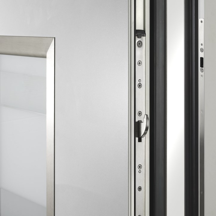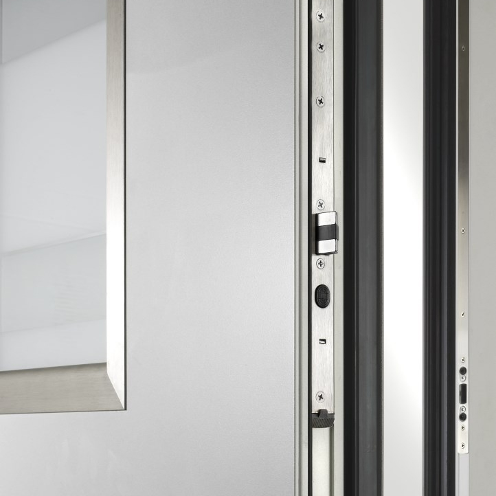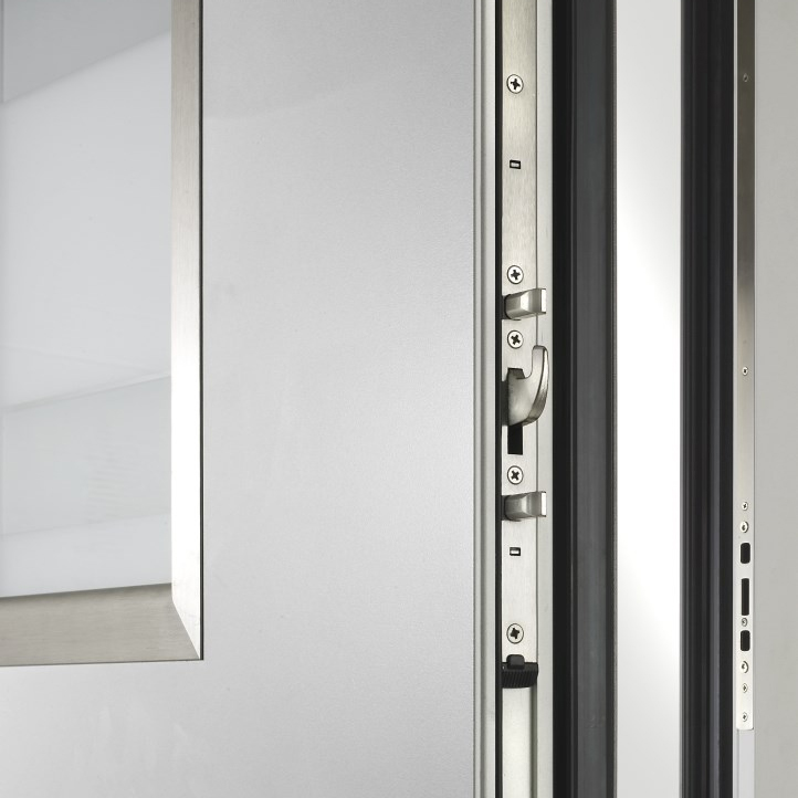 Beim 3-Punkt-Automatikschloss mit Selbstverriegelung fahren beim Schließen der Tür zwei stabile Fallenriegel aus und bewirken eine Mehrfachverriegelung.