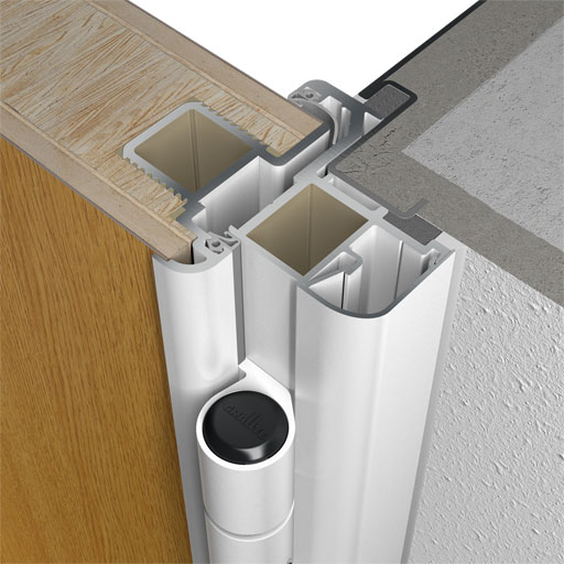 Die am Baukörper vorhandene Stahlzarge bleibt bestehen. Die Aluminium-Sicherheitszarge wird als Eckzarge von innen montiert und durch die Stahlzarge schräg im Mauerwerk verschraubt. Innen überdeckt das gerundete Aluminiumprofil die bauseitige Zarge.